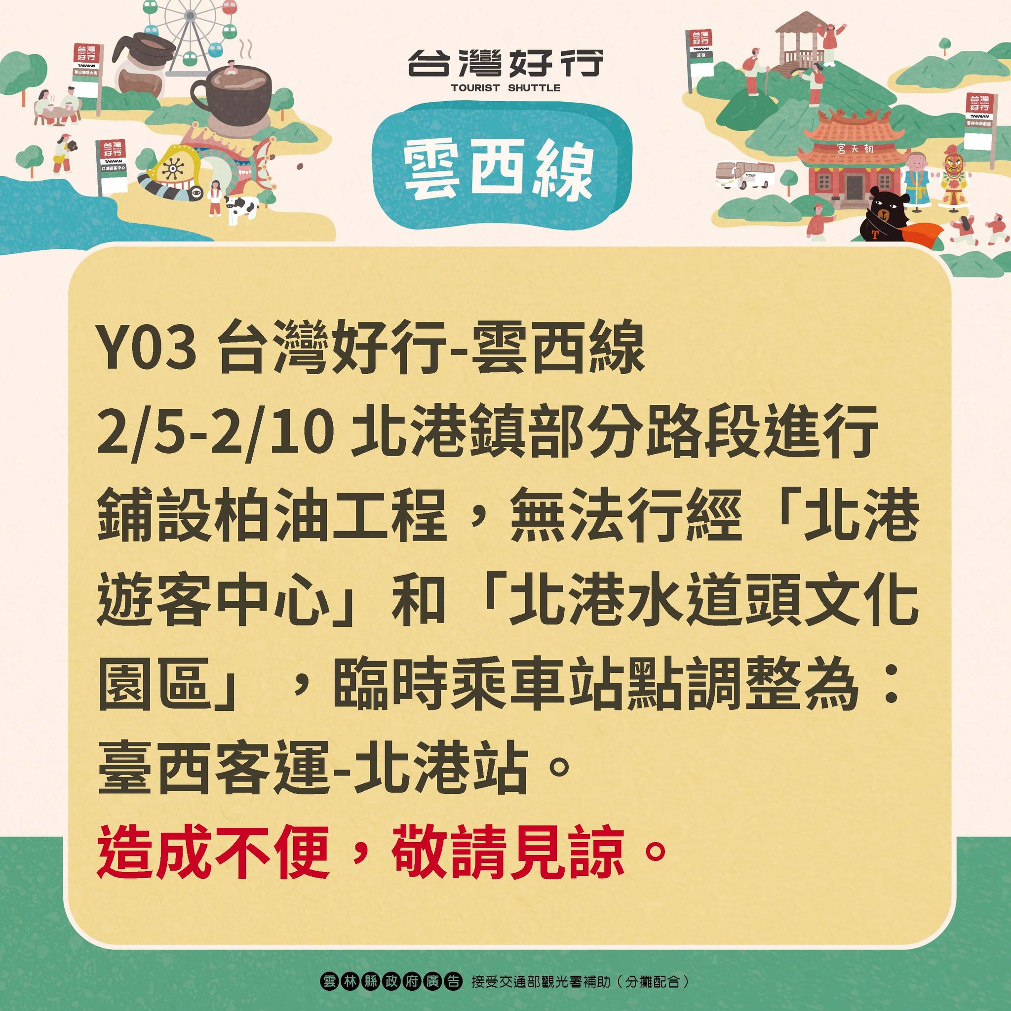 2/5(四)-2/10(二)北港鎮部分路段進行鋪設柏油工程,無法行經「北港遊客中心」和「北港水道頭文化園區」,臨時乘車站點調整為:臺西客運-北港站。造成不便,敬請見諒。