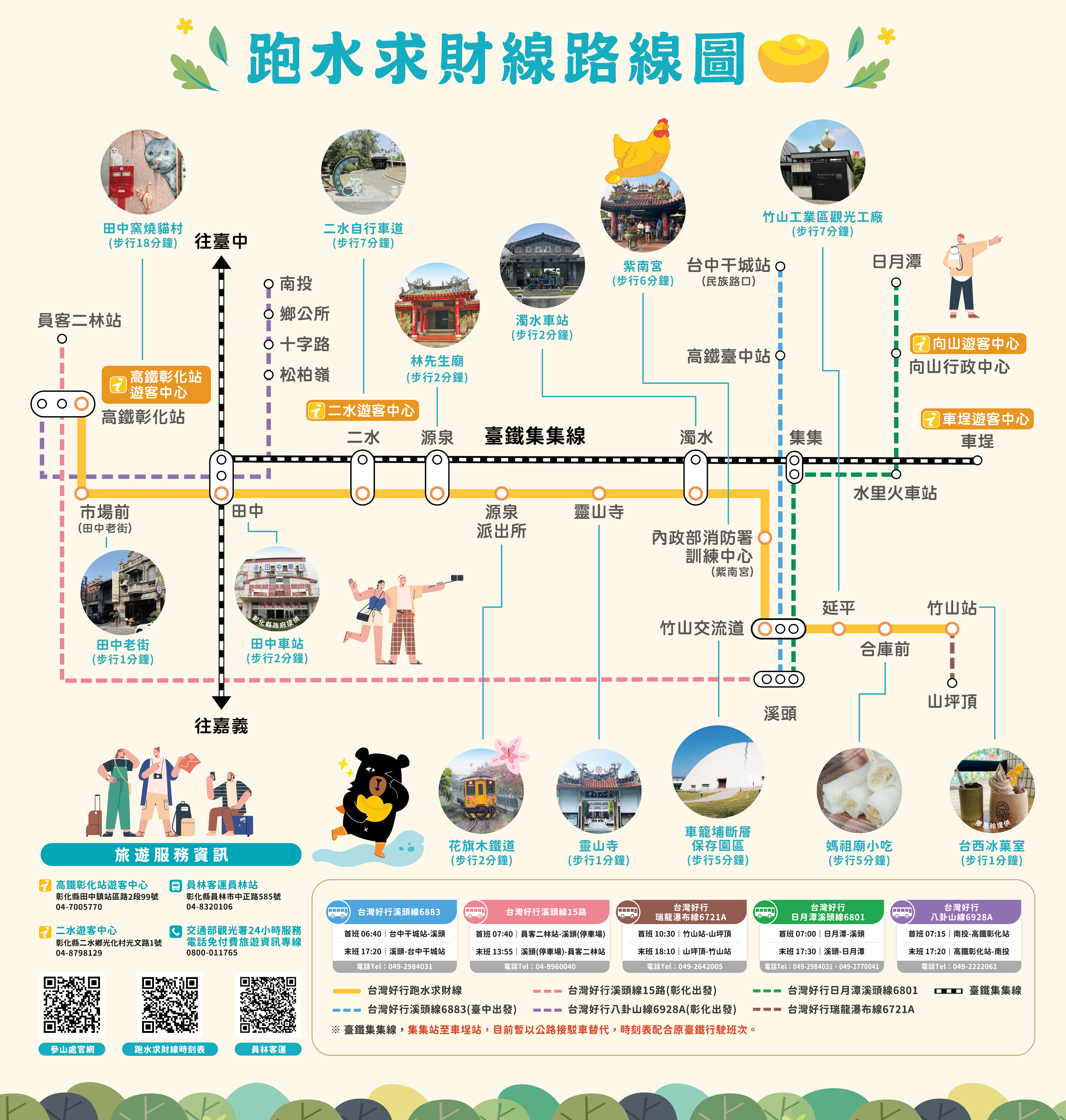 「台灣好行跑水求財線」行駛於田中→二水→竹山間,沿途經過田中車站、八堡圳、竹山紫南宮及竹山老街,沿途飽覽臺灣稻田、鐵道美景,還可經由此路線參加台灣米倉田中馬拉松、二水國際跑水節、紫南宮走春、竹山竹藝燈會等節慶活動。