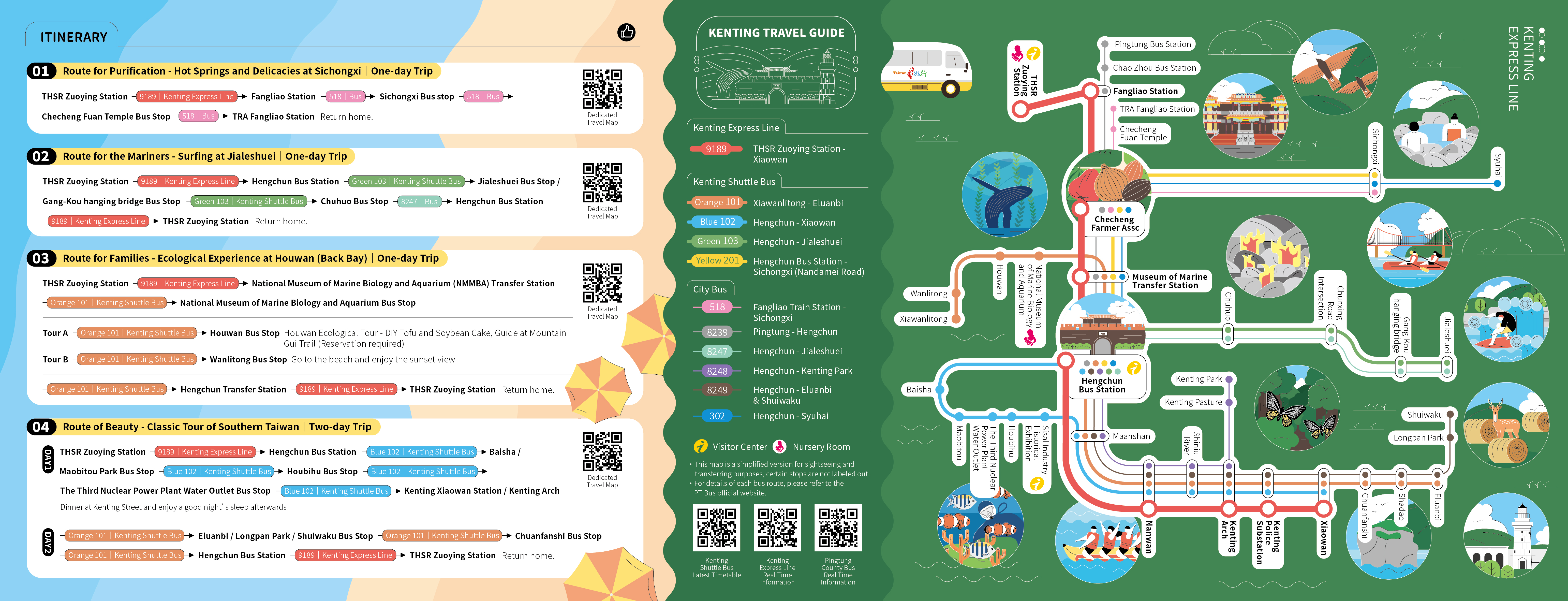 During summer and consecutive holidays (including Saturdays and Sundays), the routes between Kaohsiung and Kenting are susceptible to traffic and weather conditions, leading to traffic congestion or slow-moving traffic (as the Kenting Express Line operates on a circular schedule, delays in one departure may affect subsequent departures). If you have booked tickets for your return trip to board the High-Speed Rail (HSR) and to avoid the aforementioned impacts, it is strongly recommended to board your return trip northward 2 to 3 hours in advance to ensure a smooth journey throughout.