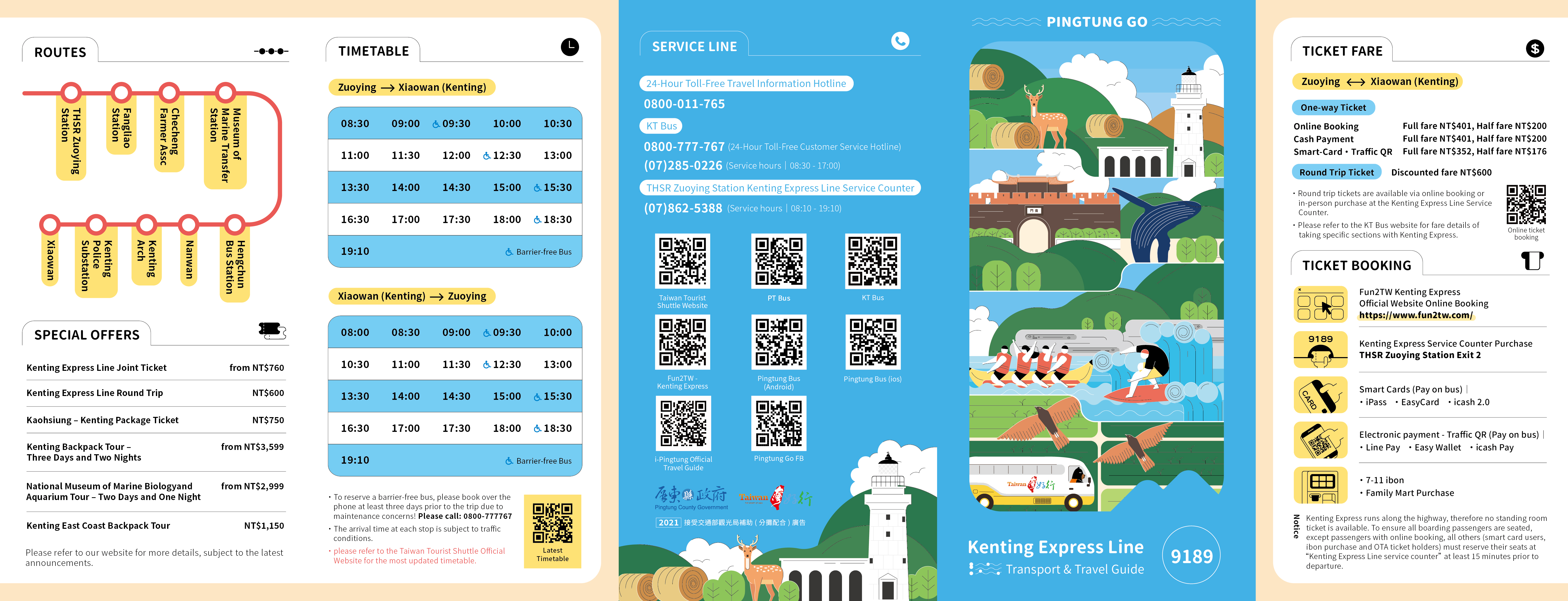 2. For cash purchases and use of contactless smart cards at other stations, please refer to the fare table of Kaohsiung- Kenting Route Joint Operations Center. Visit the site and choose “9189 Kenting Express” http://www.kt-bus.com/ticket