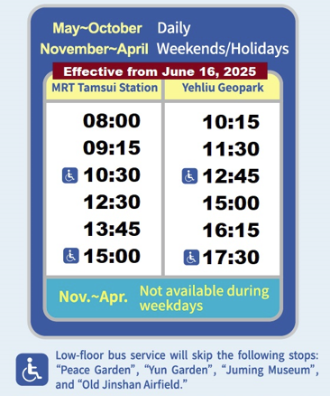* This route is serviced by both "Medium Bus” and “Low-Floor Bus.” Low-floor bus services Do Not stop at Peace Garden, Yun Garden, Juming Museum, and Old Jinshan Airfield.