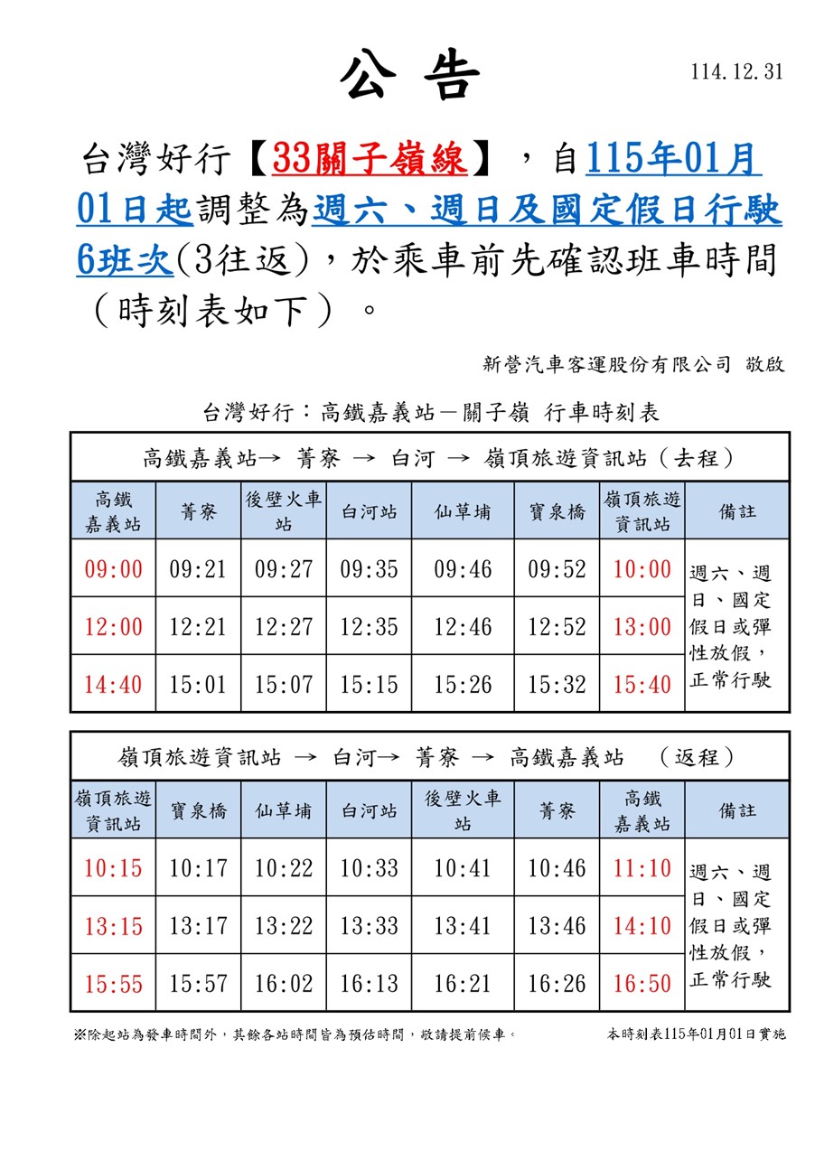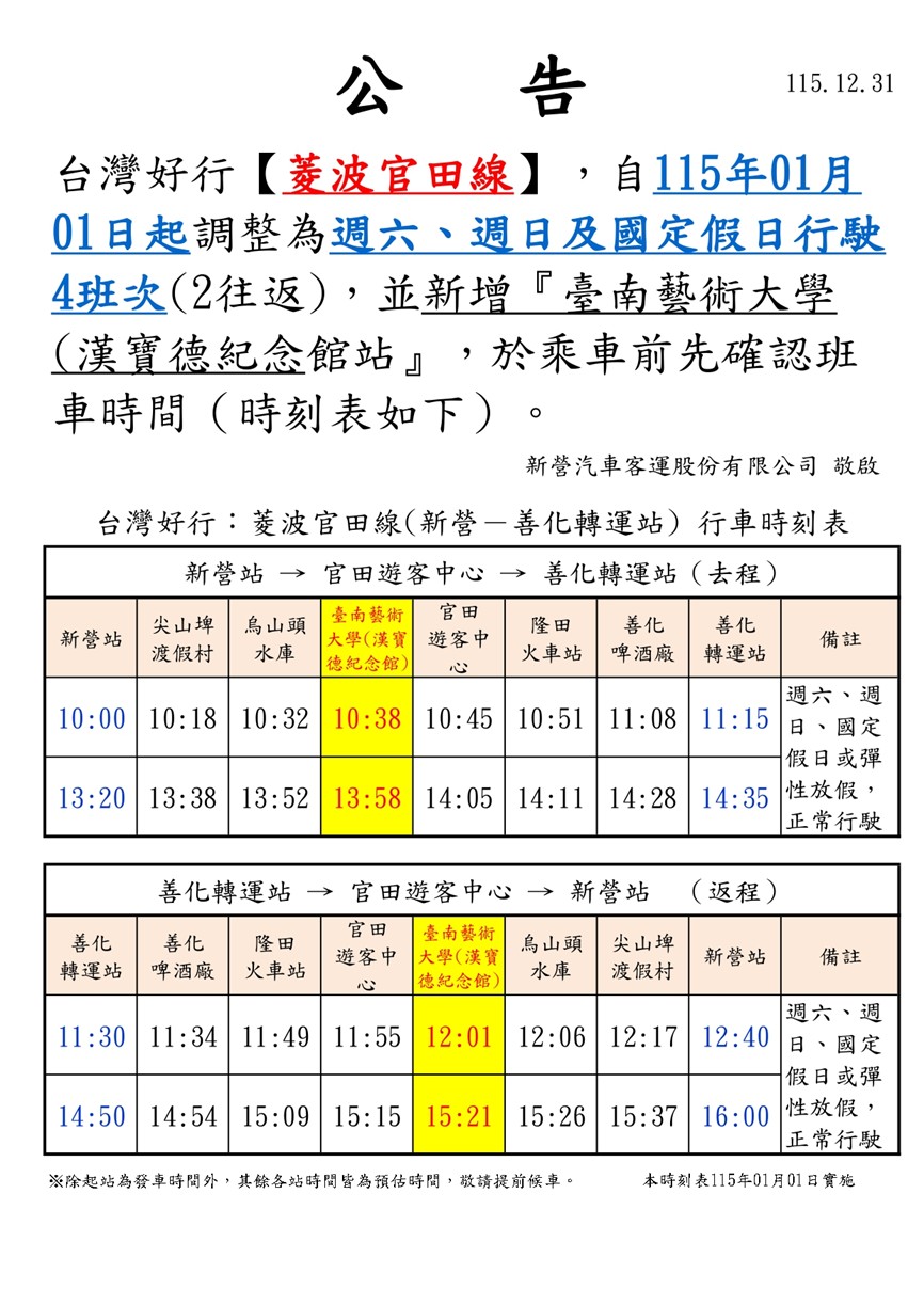 台灣好行關子嶺線及菱波官田線於115年1月1日起進行時刻更新如下: